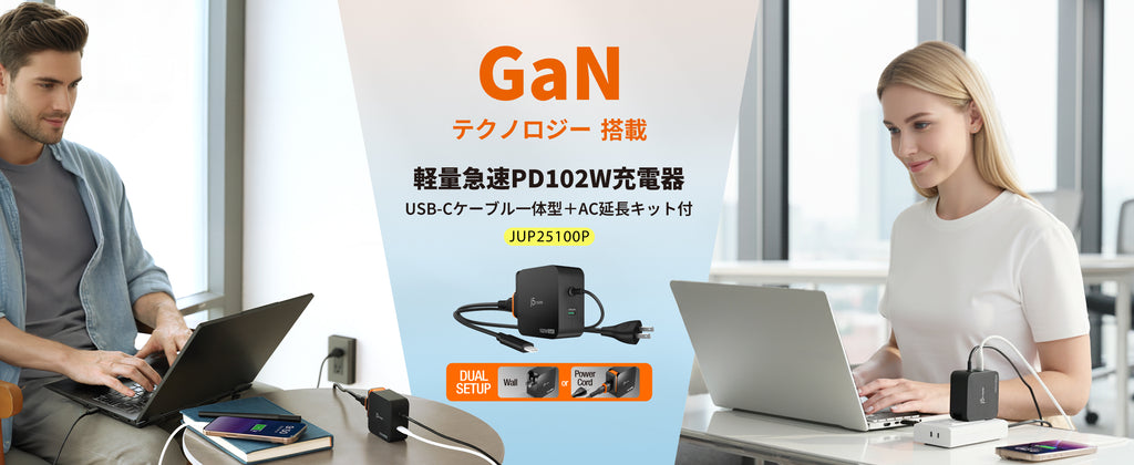 | 2024-07-05 j5create、『ケーブル一体型PD100W GaN 2ポート急速充電器JUP25102』 『スリム設計PD65W GaN 2ポート急速充電器JUP2465』 『超小型PD40W GaN2ポート急速充電器JUP2540W』 『PD70W GaN 4ポート急速充電器 JUP4370』 4つのPD対応GaN急速充電器を7月より順次発売! |